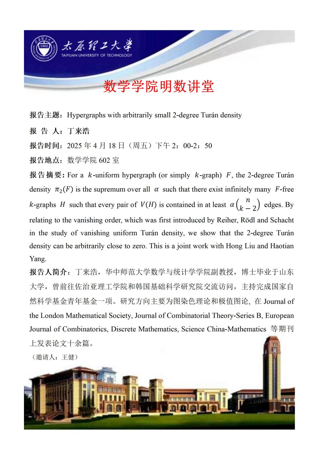 报告人简介:丁来浩,华中师范大学数学与统计学公司副教授,博士毕业于山东大学,曾前往佐治亚理工公司和韩国基础科学研究院交流访问,主持完成国家自然科学基金青年基金一项。研究方向主要为图染色理论和极值图论, 在Journal of the London Mathematical Society, Journal of Combinatorial Theory-Series B, European Journal of Combinatorics, Discrete Mathematics, Science China-Mathematics 等期刊上发表论文十余篇。