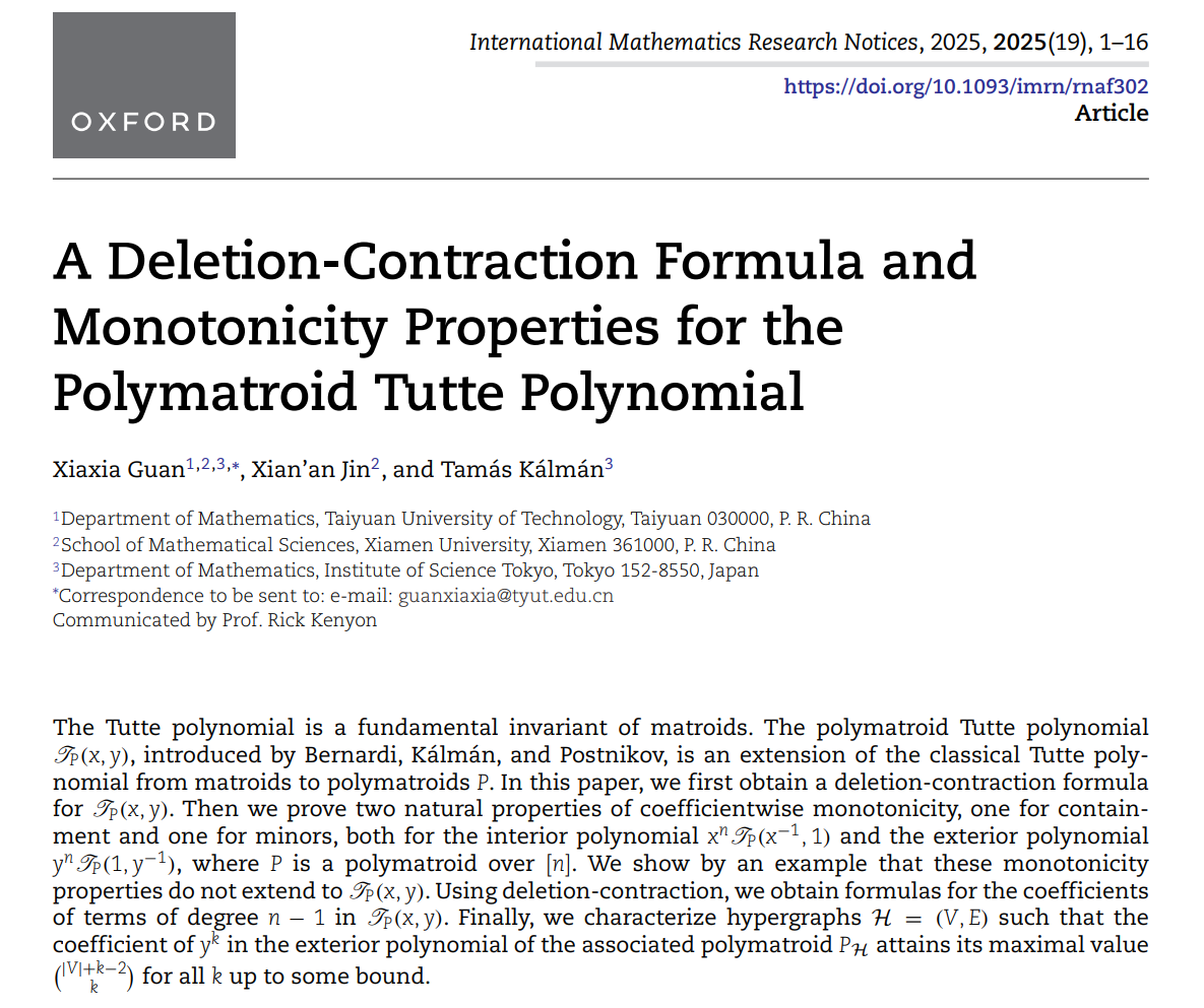 最近,公司太阳成集团tyc234cc关夏夏博士与厦门大学金贤安教授以及东京科学大学Tamás Kálmán教授合作在国际著名数学期刊《International Mathematics Research Notices》上发表了题为“A deletion-contraction formula and monotonicity properties for the polymatroid Tutte polynomial”的论文。