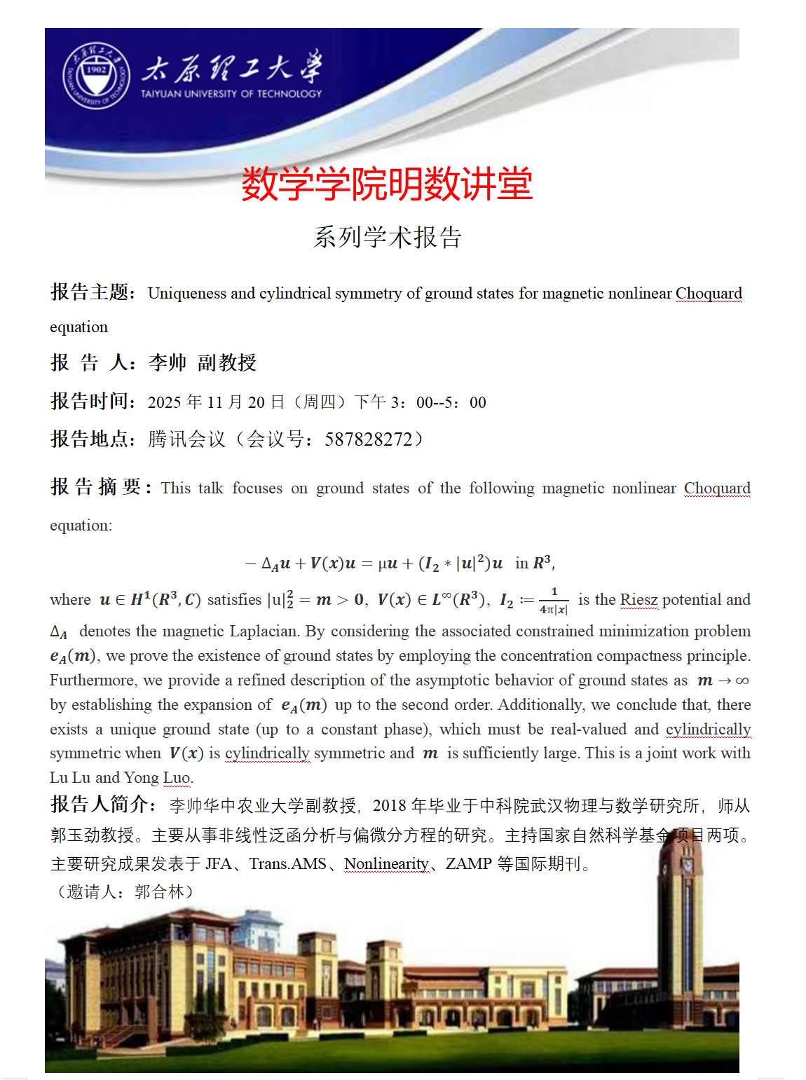 太阳成集团tyc234cc将于11月20日邀请李帅副教授做学术报告
