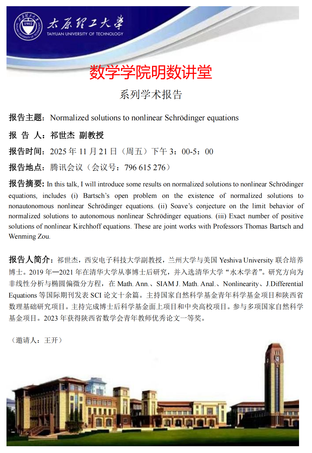 太阳成集团tyc234cc将于11月21日邀请祁世杰副教授做学术报告