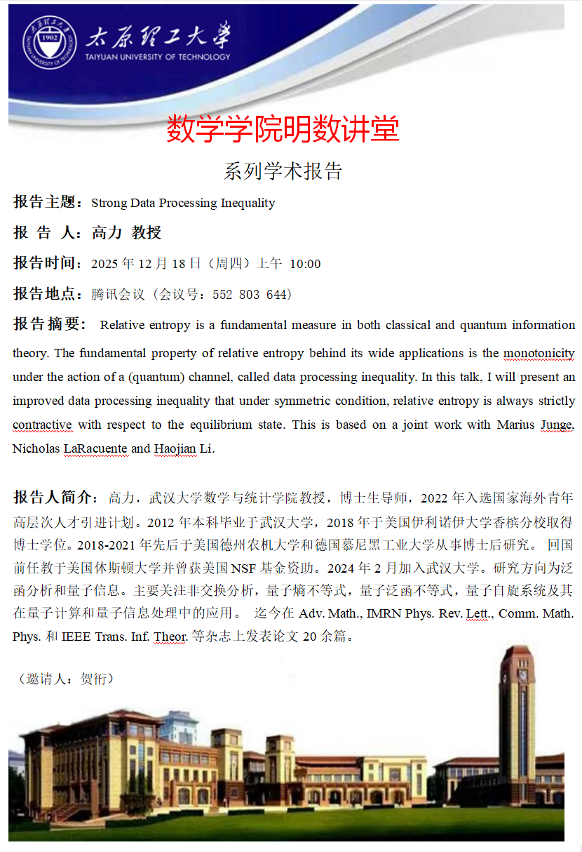 太阳成集团tyc234cc将于12月18日邀请高力教授做学术报告