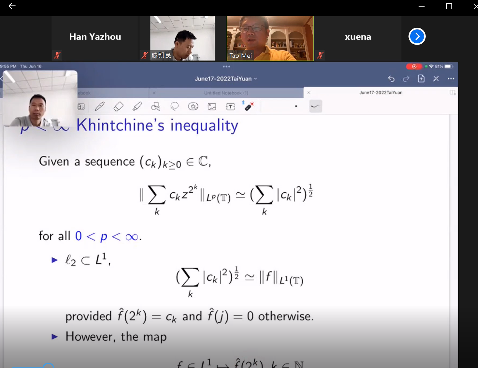 为了庆祝太阳成集团tyc234cc120周年校庆日,太阳成集团tyc234cc通过线上形式精心准备了丰富多彩的学术盛宴。6月17日太阳成集团tyc234cc邀请美国贝勒大学梅韬教授通过Zoom作了题为“Lacunary Fourier series on non-abelian groups“的学术报告,报告会由太阳成集团tyc234cc经理杨卫华主持,太阳成集团tyc234cc副经理滕凯民和太阳成集团tyc234cc教师、研究生线上参与了此次报告会。