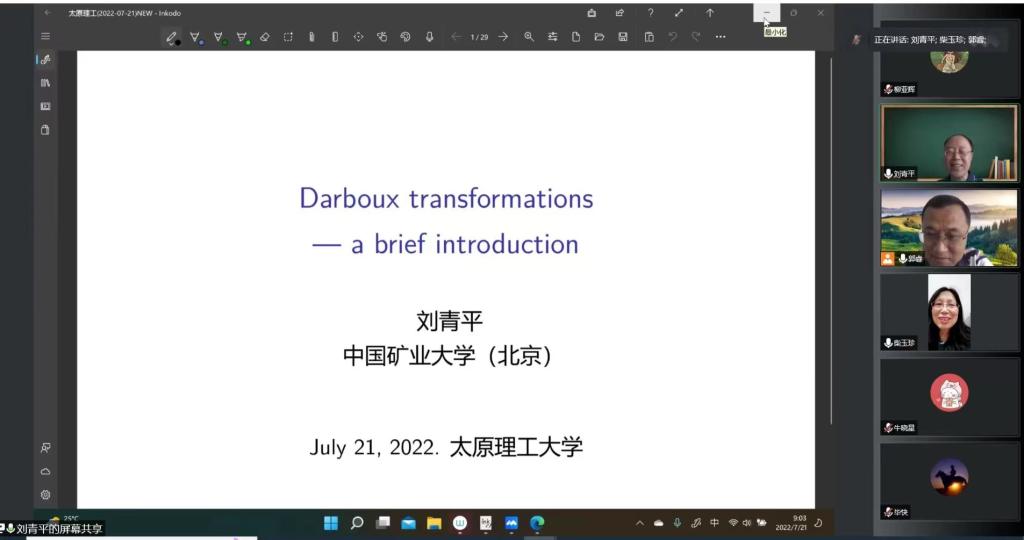 在公司百廿校庆即将到来之际,公司非线性波理论科研团队邀请到公司杰出员工、中国矿业大学(北京)理公司博士生导师刘青平教授做了题为“Darboux tansformation-a brief introduction”的学术报告。报告会由公司副经理柴玉珍教授主持,公司博士生导师张建文教授以及非线性波理论科研团队全体教师和研究生参加了报告会。