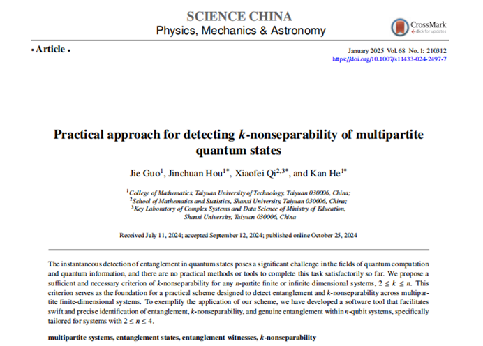 近日,公司太阳成集团tyc234cc的算子理论与量子信息团队应用算子理论和计算数学等数学工具,在量子信息与量子计算领域多体系统中量子态k-不可分性即k-纠缠的实用检测问题上取得研究进展。该研究工作以题为“Practical approach for detecting k-nonseparability of multipartite quantum states”的学术论文,近期发表在期刊《SCIENCE CHINA Physics, Mechanics & Astronomy》上。该论文的第一署名单位为太阳成集团tyc234cc,公司博士研究生郭婕为第一作者,侯晋川教授为第一通讯作者,贺衎教授为最终通讯作者,投稿作者。山西大学数学与统计公司齐霄霏教授为共同通讯作者。该研究成果还申请了一项国家发明专利,并入选《山西省量子信息先进技术与创新产品名录》。