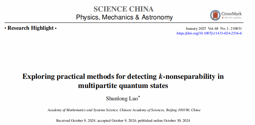 量子纠缠的识别在量子信息理论中占据基础性地位,是量子计算、量子通信等技术实现的核心要素。然而,在过去二十多年中,尽管在有限维和无限维度量子系统的纠缠判据研究已经取得了许多进展,但纠缠态的检测问题仍未得到令人满意的解决。现有的纠缠判据基本上都是属于理论性的,虽然能够识别部分特殊类的纠缠态,但它们在面对任意复杂的量子态时往往失效或无能为力,特别是在多体量子系统中,量子态具有更为复杂的纠缠结构,而现有的方法通常无法应对这些复杂情况,使得纠缠探测和分类识别问题的解决更加困难。本研究成果通过深入探讨n体系统的k-纠缠性,提出了识别多体量子系统k-纠缠态的一个新的充分且必要判据,为上述问题的解决提供了一个更为全面的视角和通用实用性较强的解决方案。这一判据不仅能够严格区分任意维度多体系统量子态的k-纠缠性,而且,相比于现有的各种纠缠判据,其突出特点是具备实用性,具备计算机软件化工具化性能。基于该判据,本成果提出了一种全新的探测多体量子系统下量子态k-纠缠性的数值处理方法,设计了一套完整的实用化的纠缠检测方案,使得对任意给定的多体量子系统,通过建立相应的数据库,构建计算机软件,以有效地完成识别任意态是否具有各类纠缠性的任务。为验证该方案的可行性,该成果还成功构建了高精度且可迅速检测量子比特数不超过4的任意量子态各类纠缠性的计算机软件。中国科公司应用数学研究所所长、量子信息与量子计算领域资深专家骆顺龙研究员在同期《SCIENCE CHINA Physics, Mechanics & Astronomy》上,作为研究亮点(Research Highlight),撰文对该研究成果进行了点评:“Recently, Guo et al. addressed this crucial challenge by exploring the k-nonseparability of multipartite quantum systems, offering a novel and comprehensive solution to detect entanglement across multiple subsystems. ”