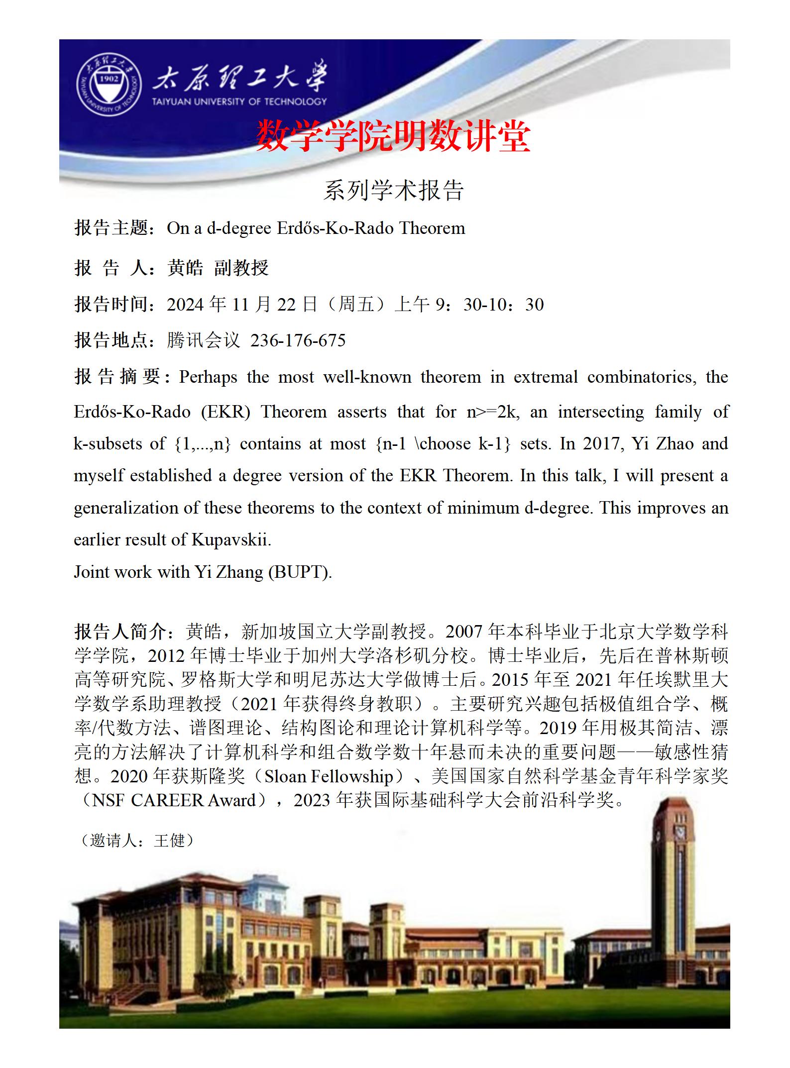 报告人简介:黄皓,新加坡国立大学副教授。2007年本科毕业于北京大学数学科学公司,2012年博士毕业于加州大学洛杉矶分校。博士毕业后,先后在普林斯顿高等研究院、罗格斯大学和明尼苏达大学做博士后。2015年至2021年任埃默里大学数学系助理教授(2021年获得终身教职)。主要研究兴趣包括极值组合学、概率/代数方法、谱图理论、结构图论和理论计算机科学等。2019年用极其简洁、漂亮的方法解决了计算机科学和组合数学数十年悬而未决的重要问题——敏感性猜想。2020年获斯隆奖(Sloan Fellowship)、美国国家自然科学基金青年科学家奖(NSF CAREER Award),2023年获国际基础科学大会前沿科学奖。