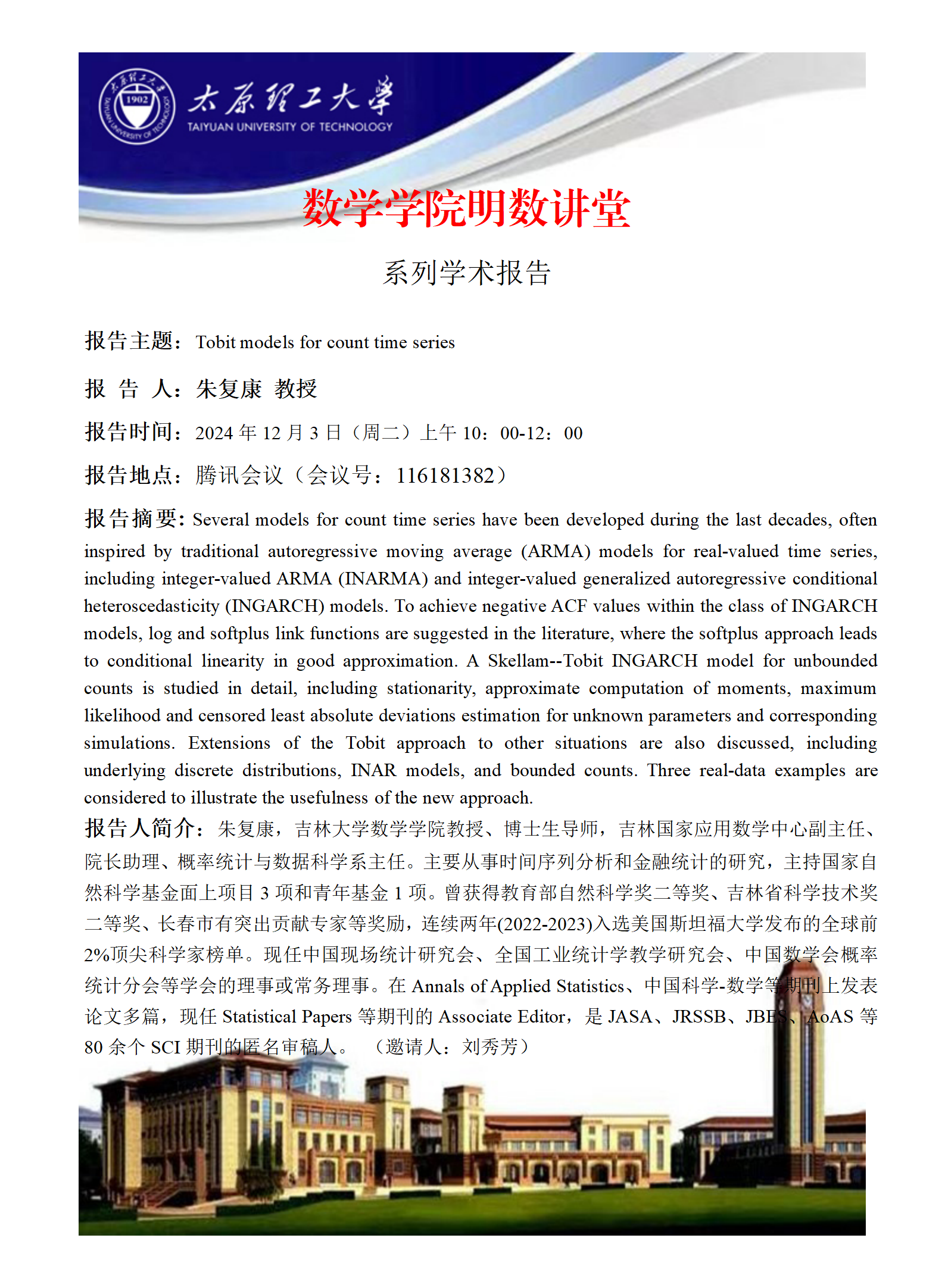 报告人简介:朱复康,吉林大学太阳成集团tyc234cc教授、博士生导师,吉林国家应用数学中心副主任、经理助理、概率统计与数据科学系主任。主要从事时间序列分析和金融统计的研究,主持国家自然科学基金面上项目3项和青年基金1项。曾获得教育部自然科学奖二等奖、吉林省科学技术奖二等奖、长春市有突出贡献专家等奖励,连续两年(2022-2023)入选美国斯坦福大学发布的全球前2%顶尖科学家榜单。现任中国现场统计研究会、全国工业统计学教学研究会、中国数学会概率统计分会等学会的理事或常务理事。在Annals of Applied Statistics、中国科学-数学等期刊上发表论文多篇,现任Statistical Papers等期刊的Associate Editor,是JASA、JRSSB、JBES、AoAS等80余个SCI期刊的匿名审稿人。