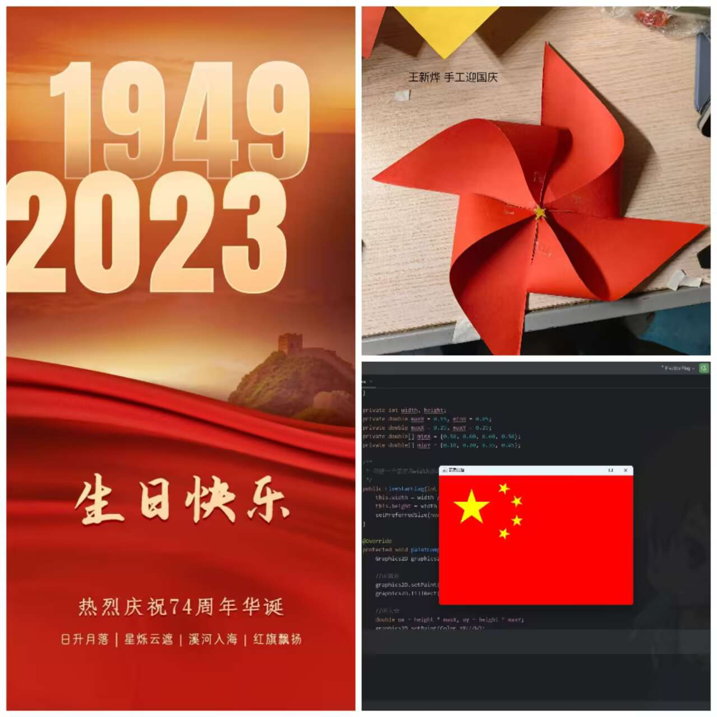特色手工欢度国庆。党员们通过绘画、剪纸、海报、结合专业知识编程设计五星红旗等特色手工活动抒发爱国情怀,增强文化自信,感受祖国几千年的文化底蕴。