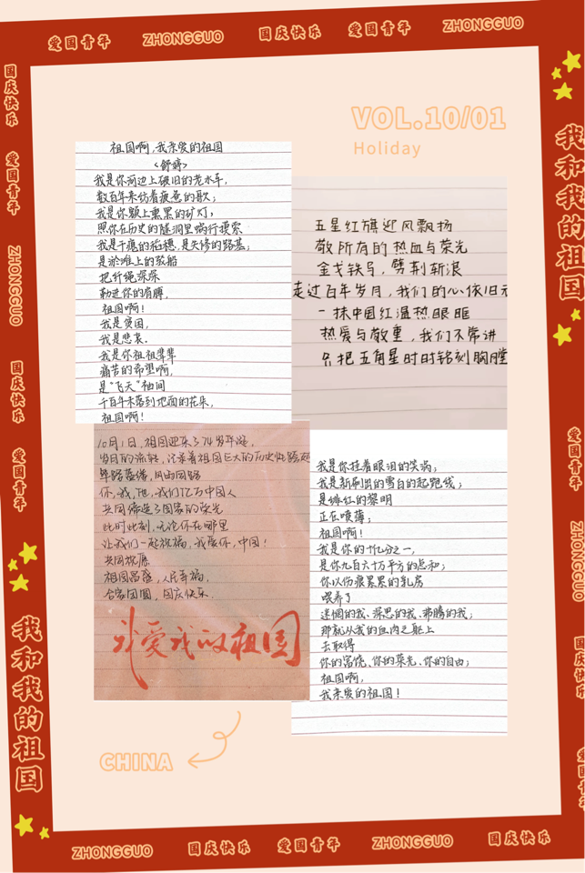 手写祝福歌颂祖国。巍巍中华,屹立东方,支部党员以笔传情,送上“祖国专属手写信”以表达自己最真挚的祝福。纸笺太短,写不下千言万语,万语千言,道不尽热血满腔,祝伟大祖国繁荣昌盛,人民生活幸福安康。