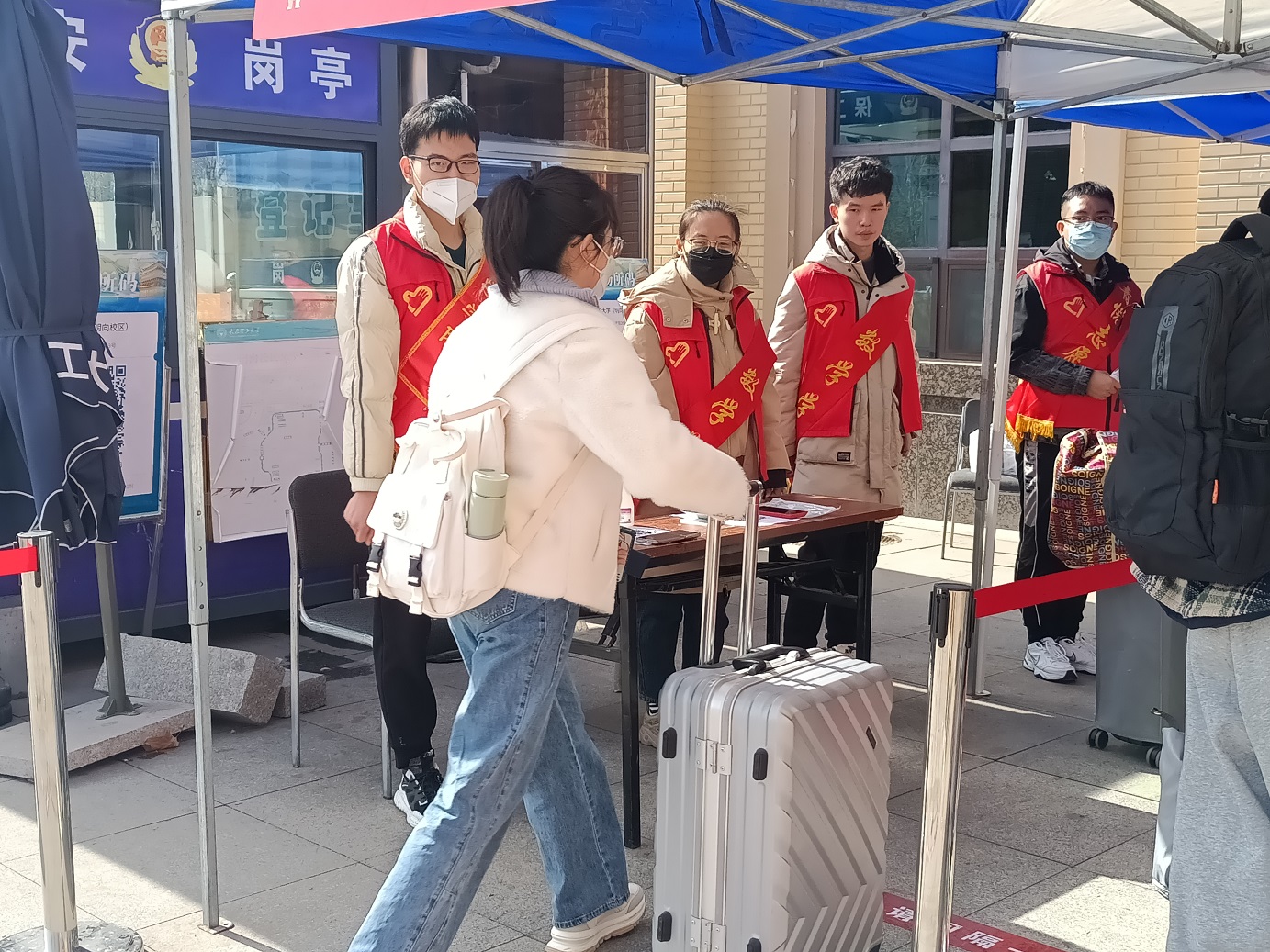 阔别两个多月,同学们带着大包小包的行李来到了公司。熙熙囔囔的人群中最显眼的还是那一个个身着红色马甲制服的志愿者,虽是春寒料峭的季节,志愿者们坚毅地伫立在风中,坚守在自己的岗位上。志愿者们分别负责在校门外对同学们进行引导,让同学们有序地进行扫码、测温、登记入校,对于同学们的问题志愿者都耐心地进行解答,帮助同学们搬运行李等。他们同心协力、明确分工、各司其职,有条不紊地为同学们提供服务,用真诚的态度与汗水诠释着“奉献、友爱、互助、进步”的志愿服务精神,用实际行动书写着数学学子的使命与担当,展现出新时代老员工奋发奉献的精神风貌。