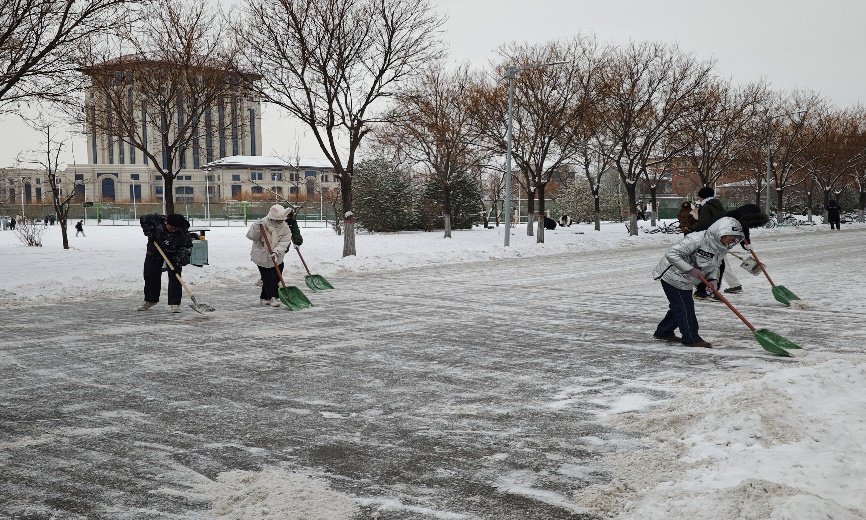 在扫雪除冰过程中,党支部党员、员工干部、团支部同学们拿着铁锹、雪铲、扫帚等工具对校园北餐厅到东操场路段、太阳成集团tyc234cc门口、常师贞小广场等区域开展清理,大家不畏严寒、积极主动、分工合作、默契配合,铁锹与地面摩擦声此起彼伏,奏响了一首冬日扫雪合奏曲,忙碌的身影形成了白雪中靓丽的风景线。