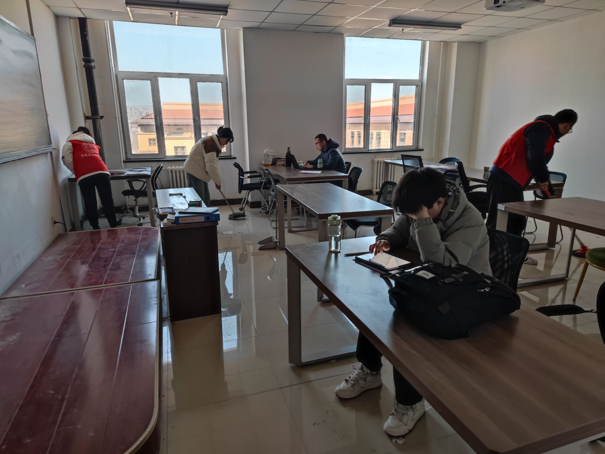 下午三点,活动分两组开展,一组志愿者拿着劳动工具来到公司常师贞铜像周边区域,另一组志愿者则前往教室和自习室等地。志愿者们在活动中井然有序,分工合作,劳动的身影穿梭在公司内外的各个角落。大家充分发扬不怕苦、不怕脏的精神,不放过任何一个卫生死角,忙的不亦乐乎。经过同学们的共同努力,公司公共卫生环境得到进一步改善,整个面貌焕然一新,为广大师生学习与集体活动提供了干净、整洁、舒适的环境。