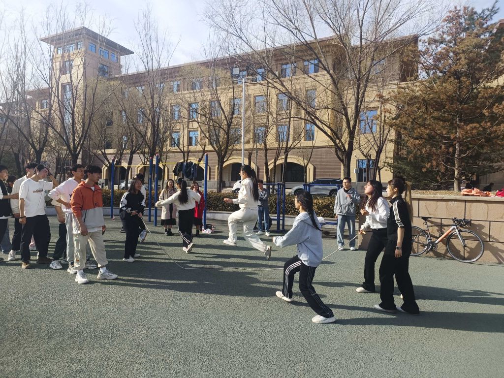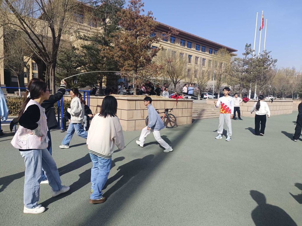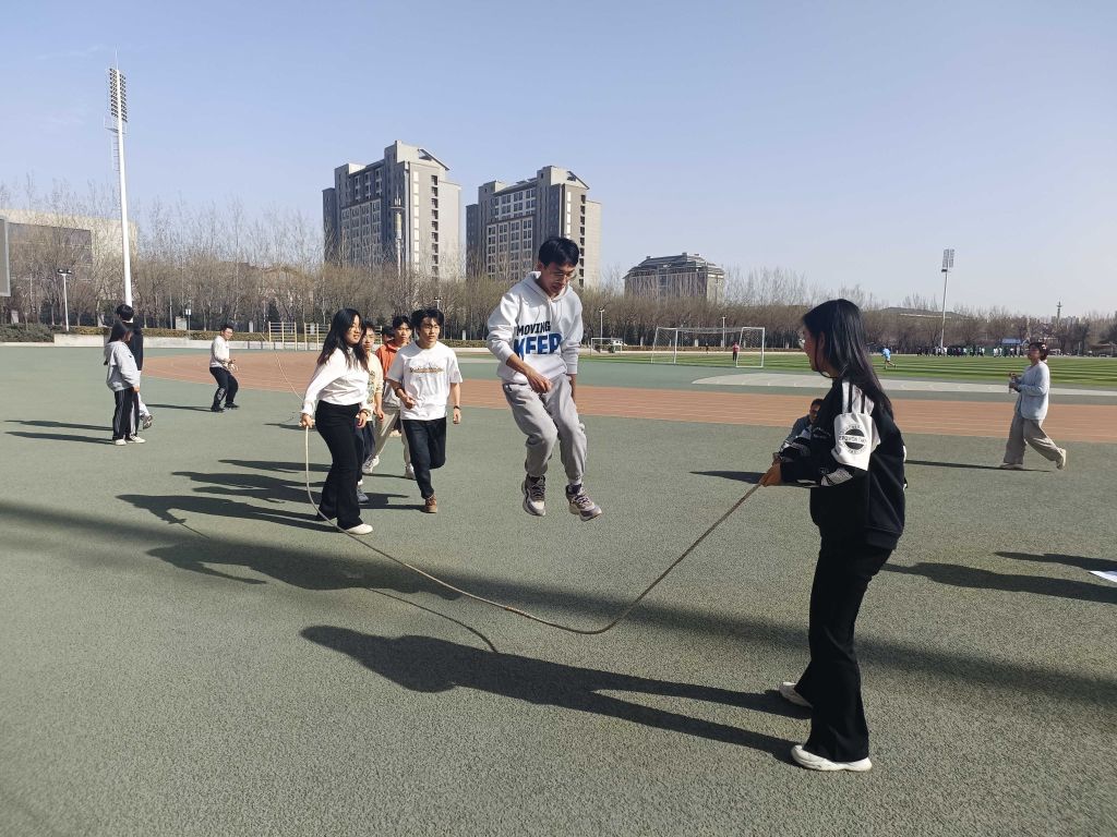 比赛如火如荼地进行着,每个队伍参赛同学之间配合默契、认真谨慎,长绳在空中飞舞,同学们身手敏捷,跃过一道道难关。虽然中途偶有失误,个别同学会被绳子绊住,但会立即调整状态,继续比赛,坚持不懈。