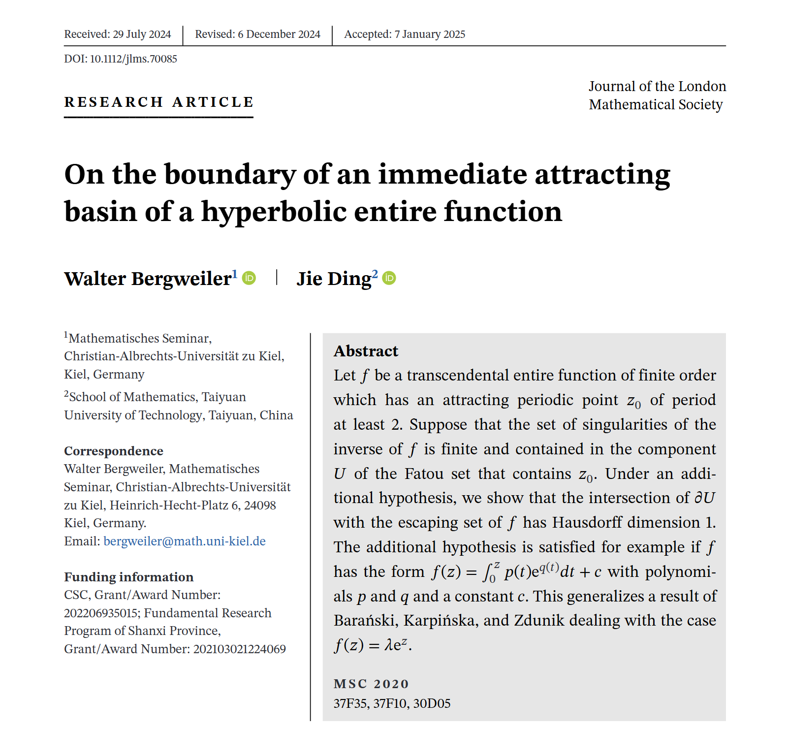 太阳成集团tyc234cc丁杰副教授与德国数学家Walter Bergweiler教授合作,在超越整函数动力系统领域取得研究进展。研究论文以“On the boundary of an immediate attracting basin of a hyperbolic entire function”为题,发表在数学领域一流国际学术期刊《Journal of the London Mathematical Society》,该期刊是数学领域“四大”期刊之外的最富声誉的国际著名期刊之一。两位合作者以姓氏字母顺序署名发表该文,以姓氏字母顺序署名是数学领域合作发表学术论文的国际惯例,中国数学会也发文呼吁国内单位广泛认同该惯例。